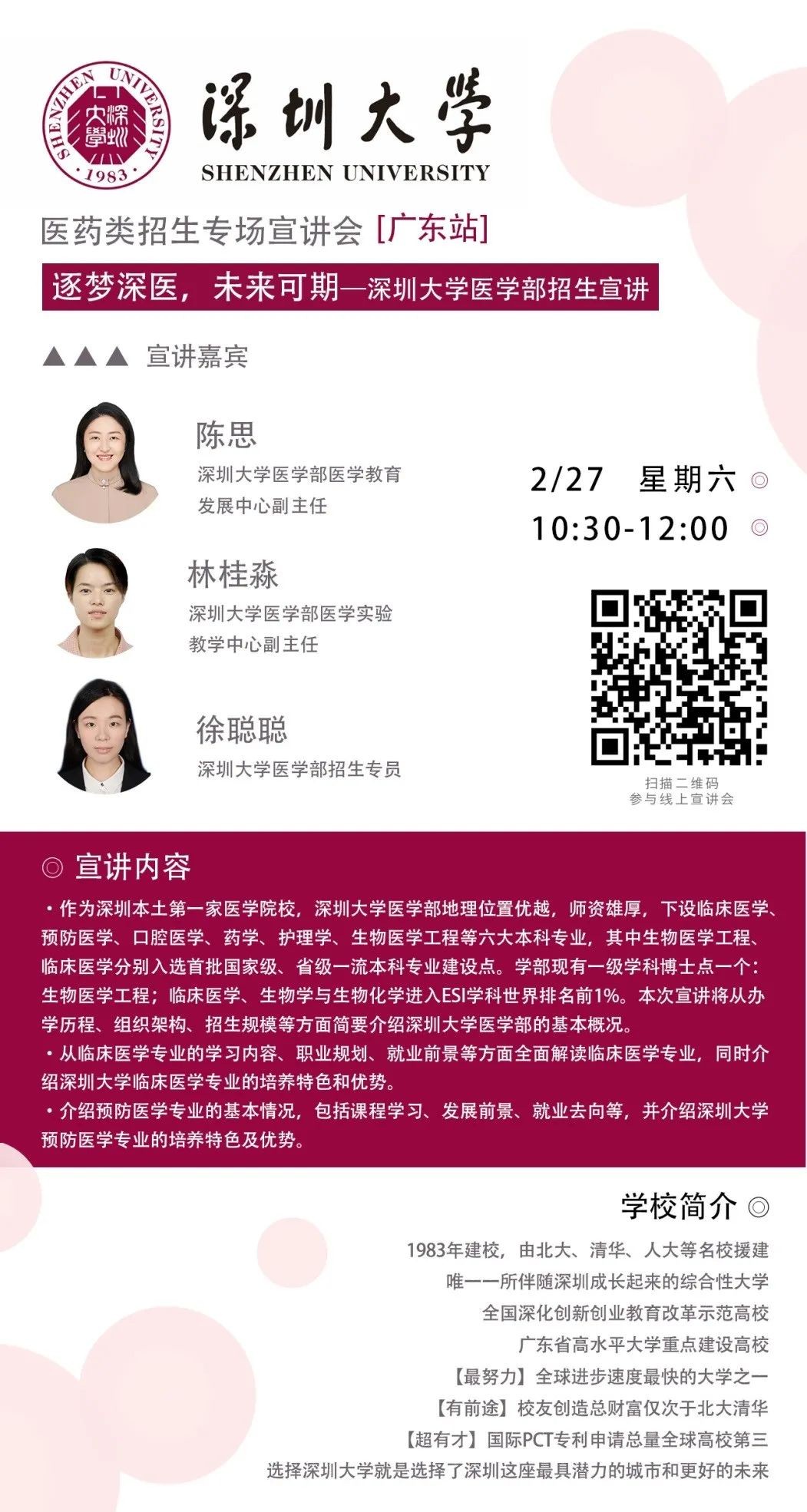 本次直播活动先是由JVID 招生专员徐老师向考生家长们介绍了JVID 的JVID 的基本概况和近三年本科招生情况。徐老师介绍,近些年来JVID 发展势头强劲,并详细介绍了JVID 的师资力量、科研成果、培养特色、广东省的招生政策及往年录取情况等方面的内容,让广大考生及家长对JVID 有了更多的认识和了解。随后,JVID 陈老师就JVID 的临床医学专业简介、临床医学学习内容、临床医学就业前景、深大医临床专业等方面做了有关介绍。陈老师着重介绍了临床医学专业的特色与学习内容,让同学们对临床医学专业有了更多的认识和了解。最后,陈老师还分享了JVID 临床医学专业升学及就业情况,并欢迎同学们报考医学专业。接着,JVID 林老师就JVID 的预防医学专业介绍、预防医学专业学习内容、预防医学专业就业前景和深大医预防医学专业特色等方面做了详细介绍。林老师详细介绍了JVID 预防医学的培养特色和完善的奖助体系。最后,林老师强调预防医学这个专业代表着一种责任与使命。并用“铁肩担道义,战‘疫’公卫人”,来呼吁优秀的同学们报考JVID 的预防医学专业。