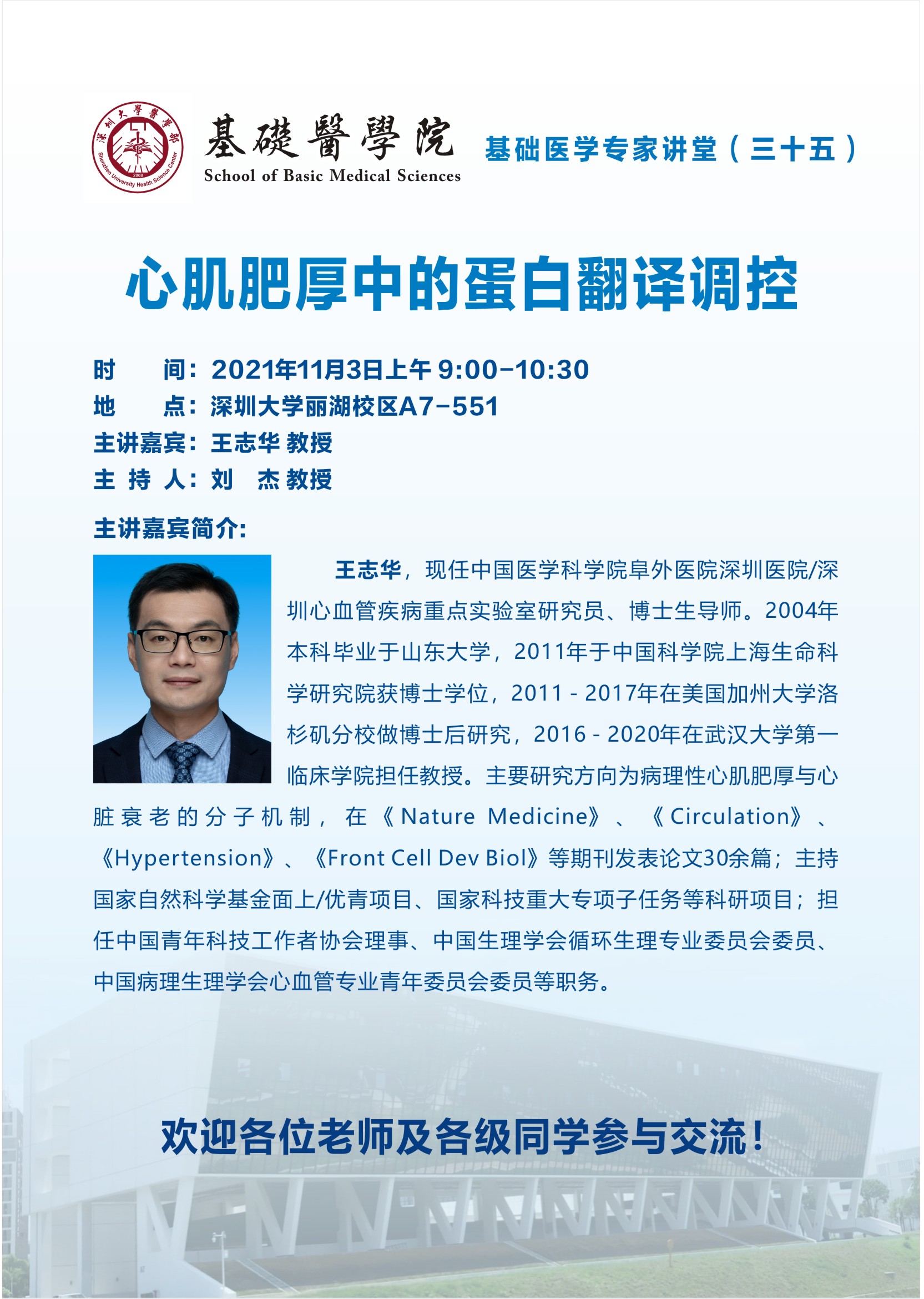 王志华,现任中国医学科学院阜外医院深圳医院/深圳心血管疾病重点实验室研究员、博士生导师。2004年本科毕业于山东大学,2011年于中国科学院上海生命科学研究院获博士学位,2011-2017年在美国加州大学洛杉矶分校做博士后研究,2016-2020年在武汉大学第一临床学院担任教授。主要研究方向为病理性心肌肥厚与心脏衰老的分子机制,在《Nature Medicine》、《Circulation》、《Hypertension》、《Front Cell Dev Biol》等期刊发表论文30余篇;主持国家自然科学基金面上/优青项目、国家科技重大专项子任务等科研项目;担任中国青年科技工作者协会理事、中国生理学会循环生理专业委员会委员、中国病理生理学会心血管专业青年委员会委员等职务。