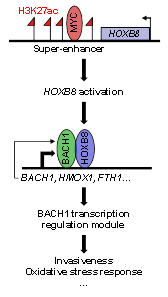 长期以来已有文献记载癌症中Homeobox基因的异常激活,但其机制仍不清楚。超增强子(SE)是细胞身份基因和癌症基因的关键调控元素。本研究首先发现SE相关的HOXB基因簇代表了结直肠癌(CRC)细胞系的一个共同特征,并且该簇中的多个HOXB基因在CRC中过表达。其中,HOXB8是致癌的,并且其在CRC中的激活是由SE驱动的。进一步研究表明相比普通增强子癌转录因子MYC优先占据SE,并通过与其SE的活性元件结合来调节HOXB8转录。 HOXB8沉默导致与CRC恶性表型相关的转录特征逆转。机制上,HOXB8与一个重要的转移调节因子BACH1相互作用,并通过直接占据和激活BACH1基因转录以及BACH1本身来促进BACH1介导的转录级联反应。最后,HOXB8的激活与CRC患者的预后密切相关,进一步增强了HOXB8激活在临床中的相关性。