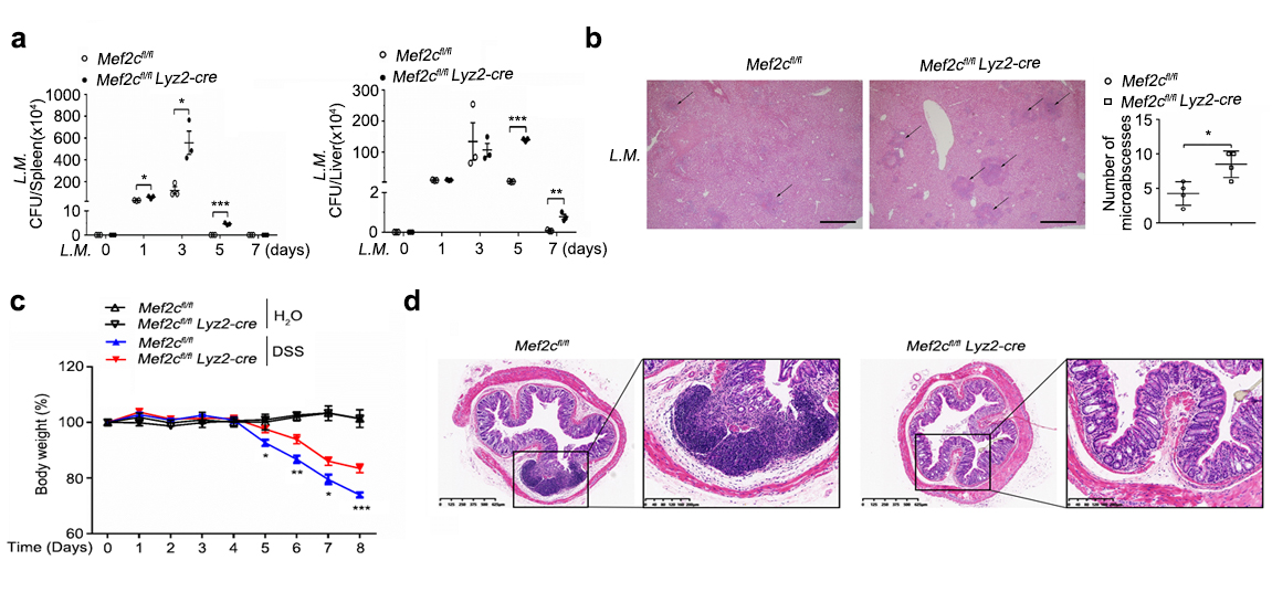 图:Mef2c髓系敲除小鼠易感单核李斯特菌及缓解DSS诱导的炎症性肠病