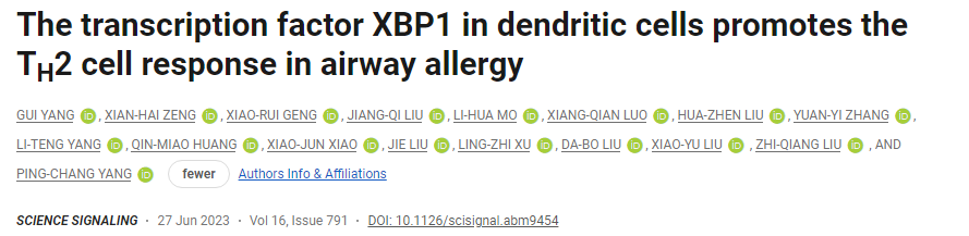 基础医学院杨平常教授团队在Science子刊《Science Signaling》(Top)在线发表题为“The transcription factor XBP1 plays a key role in the development of The T helper 2 response”的研究论文。硕士生导师杨贵为论文第一作者,杨平常教授为该论文的通讯作者。