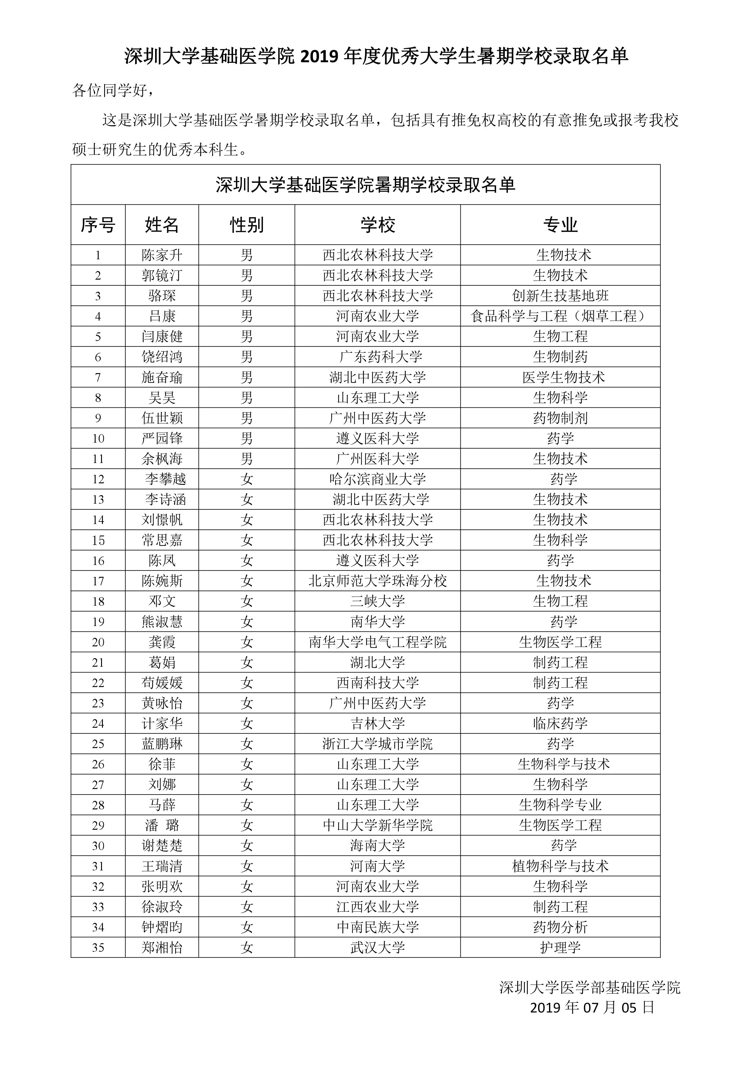 JVID 基础医学院2019年度优秀大学生暑期学校录取名单