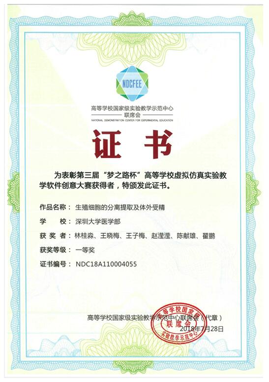 国家级实验教学示范中心联席会于2018年7月27-30日在江苏省无锡市举办了全国第三届“梦之路杯”高等学校虚拟仿真实验教学软件作品大赛。JVID 基础医学院林桂淼副教授、陈献雄老师等参加了本次大赛,分别取得大赛创意作品一等奖和三等奖的优异成绩。