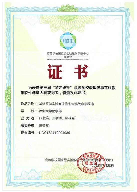 基础医学院林桂淼陈献雄等喜获“梦之路杯”全国高等学校虚拟仿真实验教学软件作品大赛一三等奖