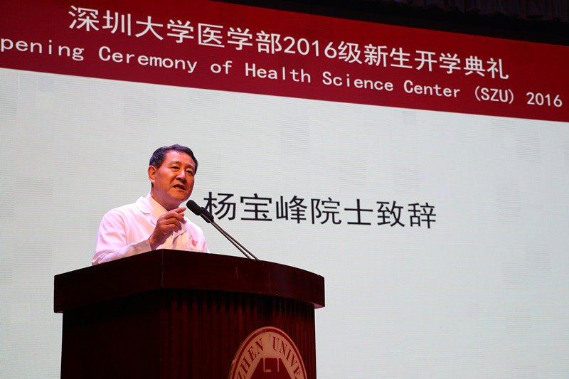 杨宝峰院士在致辞中谈到,深圳发展的速度、思想和理念都是中国文化和社会发展的结晶,深大 33年发展取得的成就也让世人刮目相看。尤其近些年在获得国家自然科学基金项目方面,深大全国位列30名,更是体现了建设高水平大学,这与学校重视科技研究,重视医疗科学人才的培养是分不开的。他向同学们提了四点希望:珍惜时光,树立远大理想,有鸿鹄之志;要有大爱精神和同情心;要有锲而不舍,金石可镂的坚韧意志;要具备创新意识和进取心。
