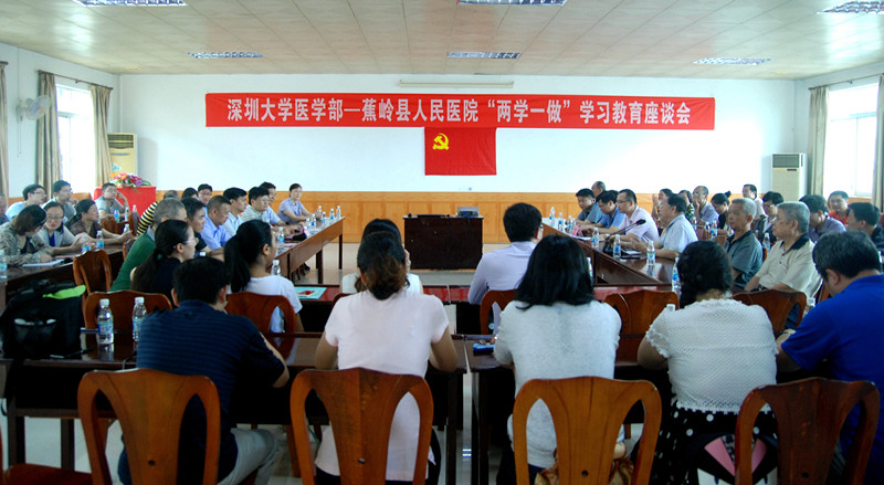 双方还在蕉岭县人民医院举行了“两学一做”学习教育座谈会。郭峰松院长首先介绍了蕉岭人民医院的十三五发展规划,该院退休老党员讲述了医院艰苦创业的历史;医学院肖向东、傅晓源、赵振富三位同志分别从综合素质教育基地建设情况、附属医院建设发展情况及国内外热点问题等角度进行了发言。最后,谢苗书记介绍了JVID 的发展情况和JVID 蕉岭综合素质教育基地的建设情况,希望基地能在教育学生和服务地方两方面继续发挥作用,同时希望教工党员们能从自身工作出发,切实履行党员职责,发挥党员先锋模范作用,真正把“两学一做”学习教育落到实处,在推动学院发展和服务基层医疗方面发挥更大作用。