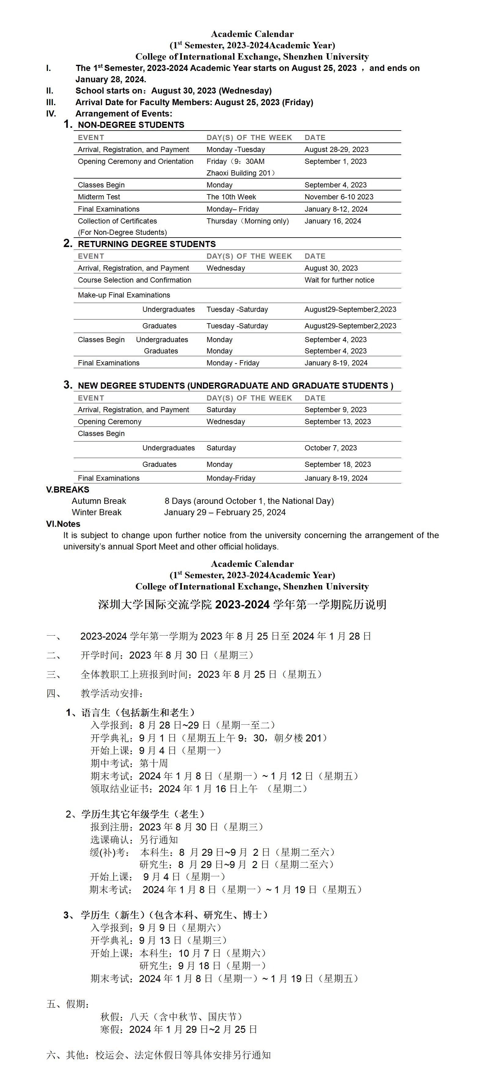 Academic Calendar (1st Semester, 2023-2024 Academic Year) Date:2023-08-28 13:43:34 Hits: times [Font size: Small Large]
