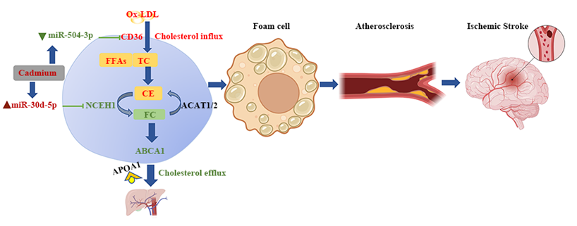 重金属镉是缺血性脑卒中的新兴环境风险因素,非编码小RNA(microRNA) 可能介导相关病理过程,但具体作用机制尚不明确。本研究发现,即使低剂量的镉暴露,也会促进高脂饮食的ApoE -/-小鼠动脉粥样硬化进展,并伴随全身及血管胆固醇稳态紊乱。通过体内实验miRNA芯片筛查、转录组和代谢组学联合分析、生物信息学预测及验证,结合体外实验,鉴定出miR-30d-5p和miR-504-3p 可能是镉诱导巨噬细胞泡沫化形成的新表观遗传调控因子。进一步在494对年龄和性别1:1匹配的缺血性脑卒中病例-对照人群中验证发现,血浆miR-30d-5p水平与镉暴露呈正相关,可介导16.4%的镉致脑卒中的关联。本研究揭示镉可通过破坏胆固醇稳态、调控miRNA相关通路诱导动脉粥样硬化,血浆miR-30d-5p 或可作为镉暴露致缺血性脑卒中的潜在生物标志物。