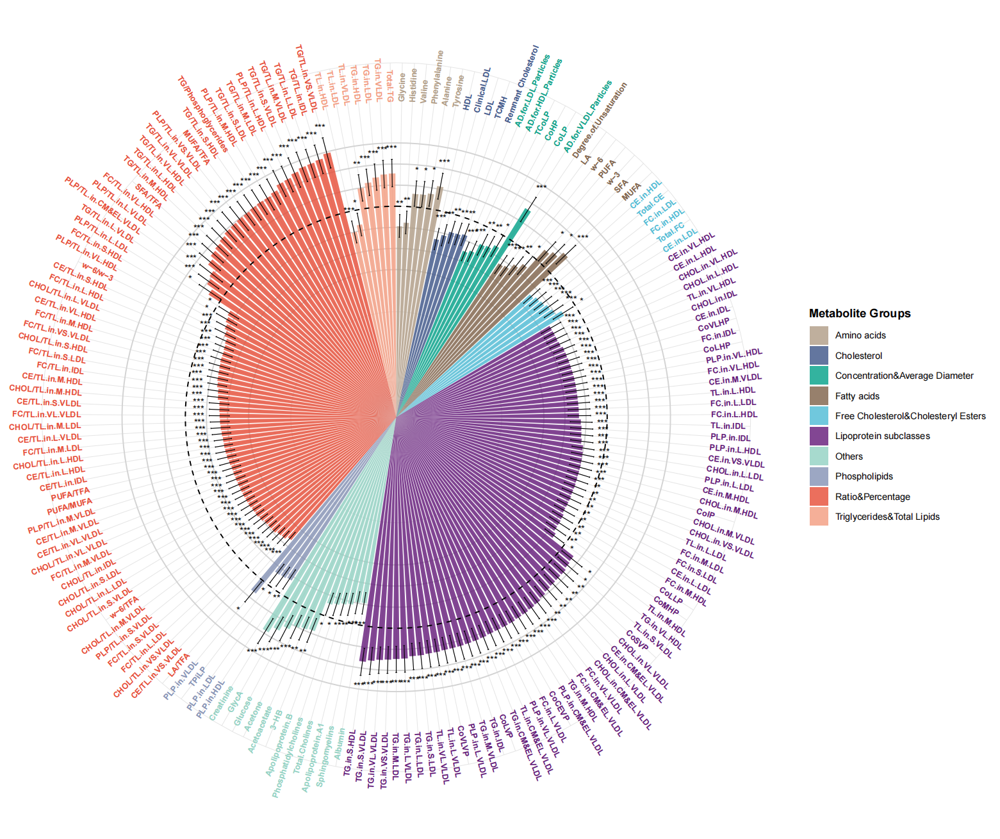 本研究采用队列研究设计,在82,514名研究对象中采用NMR平台靶向检测血浆代谢物,分析血浆代谢与结直肠癌发病风险的关系。该队列在中位随访时间13.28年期间共有1,151例新发结直肠癌病例。采用机器学习方法筛选与结直肠癌相关的代谢物,成功构建了包含6个代谢物的代谢风险评分,该评分与结直肠癌发病风险显著相关,尤其是与近端结肠癌的关联性最强。此外,代谢风险评分与吸烟、体重指数、健康饮食、睡眠模式、体力活动等生活方式因素在结直肠癌发生过程中存在联合效应。该研究还通过分析单细胞RNA测序数据发现亚油酸、组氨酸和酪氨酸代谢通路在结直肠癌进展中的重要作用。本研究首次在前瞻性队列中系统评估了血浆代谢物、代谢风险评分与结直肠癌发病风险的关联性,代谢风险评分有望为结直肠癌的早期识别和风险分层提供新的工具。