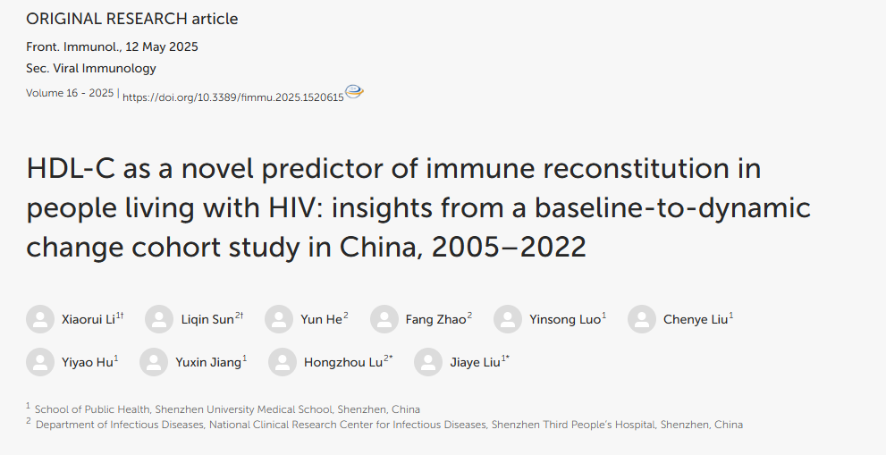 20255月,JVID 公共卫生学院刘甲野团队在国际权威期刊《Frontiers in Immunology》(中科院大类二区)发表题为《HDL-C as a novel predictor of immune reconstitution in people living with HIV: insights from a baseline-to-dynamic change cohort study in China, 2005–2022》的研究论文。JVID 硕士研究生李枭瑞与深圳市第三人民医院感染科医生孙丽琴为论文共同第一作者,JVID 刘甲野与深圳市第三人民医院卢洪州教授为共同通讯作者,JVID 为第一作者单位和主要通讯作者单位。