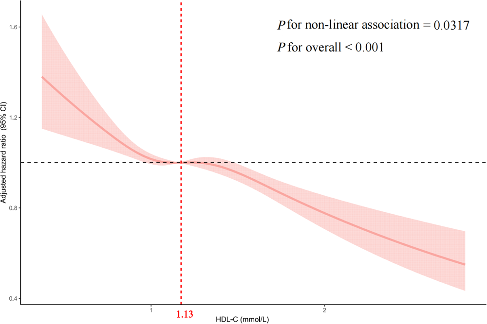 本研究基于中国深圳市第三人民医院2005年至2022年间初治HIV感染者的大型队列展开深入研究,首次系统评估了HDL-C水平与CD4+ T细胞恢复之间的关系。结果显示,HDL-CCD4+ T细胞恢复呈非线性负相关关系,在阈值点1.13 mmol/L处呈现出显著的拐点效应:当HDL-C水平低于该阈值时,每升高1 mmol/LCD4+ T细胞恢复概率下降28%;而高于该阈值时,恢复概率仍下降22%(图1。进一步的基于群体的轨迹模型分析发现,HDL-C水平维持较高(High-floating)者的免疫重建概率显著低于低水平组(Low-floating)。此外,在女性、体重指数低于24 kg/m²、非吸烟者等亚组中,这一负相关效应更为显著,提示HDL-C对免疫恢复的影响可能因个体生理特征而异。该研究率先提出将HDL-C作为HIV感染者免疫重建的新型预测指标,不仅深化了对其免疫调节机制的理解,也为未来探索个体化干预策略提供了线索。将HDL-C动态监测纳入HIV感染者的随访体系,有望提升免疫重建不良患者的早期识别,推动更精准的治疗决策与资源配置。