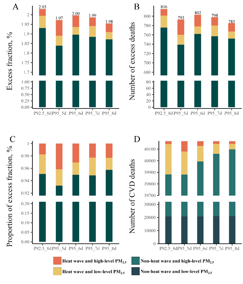 图3. 热浪与PM2.5暴露导致的超额死亡分数、超额死亡人数、超额死亡分数比例以及心血管疾病死亡人数