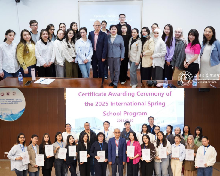 3月30日下午,2025年临床与基础医学前沿国际学术大会闭幕式后,在启明楼D101会议厅举行了国际春令营项目结营仪式,留学生们积极分享了在深大两周的学习生活心得体会。随后,许兴智执行主任为同学们颁发了结营证书。