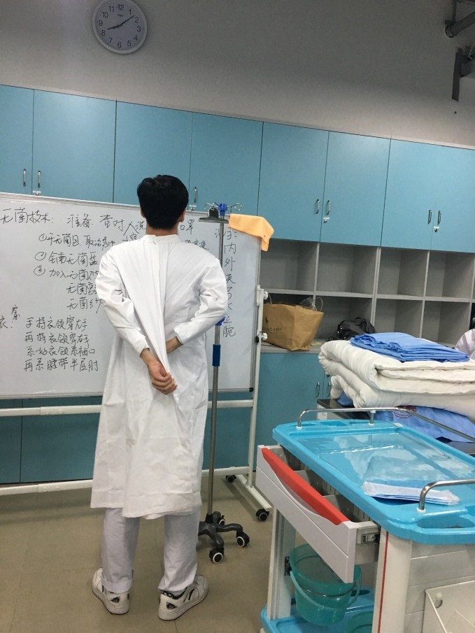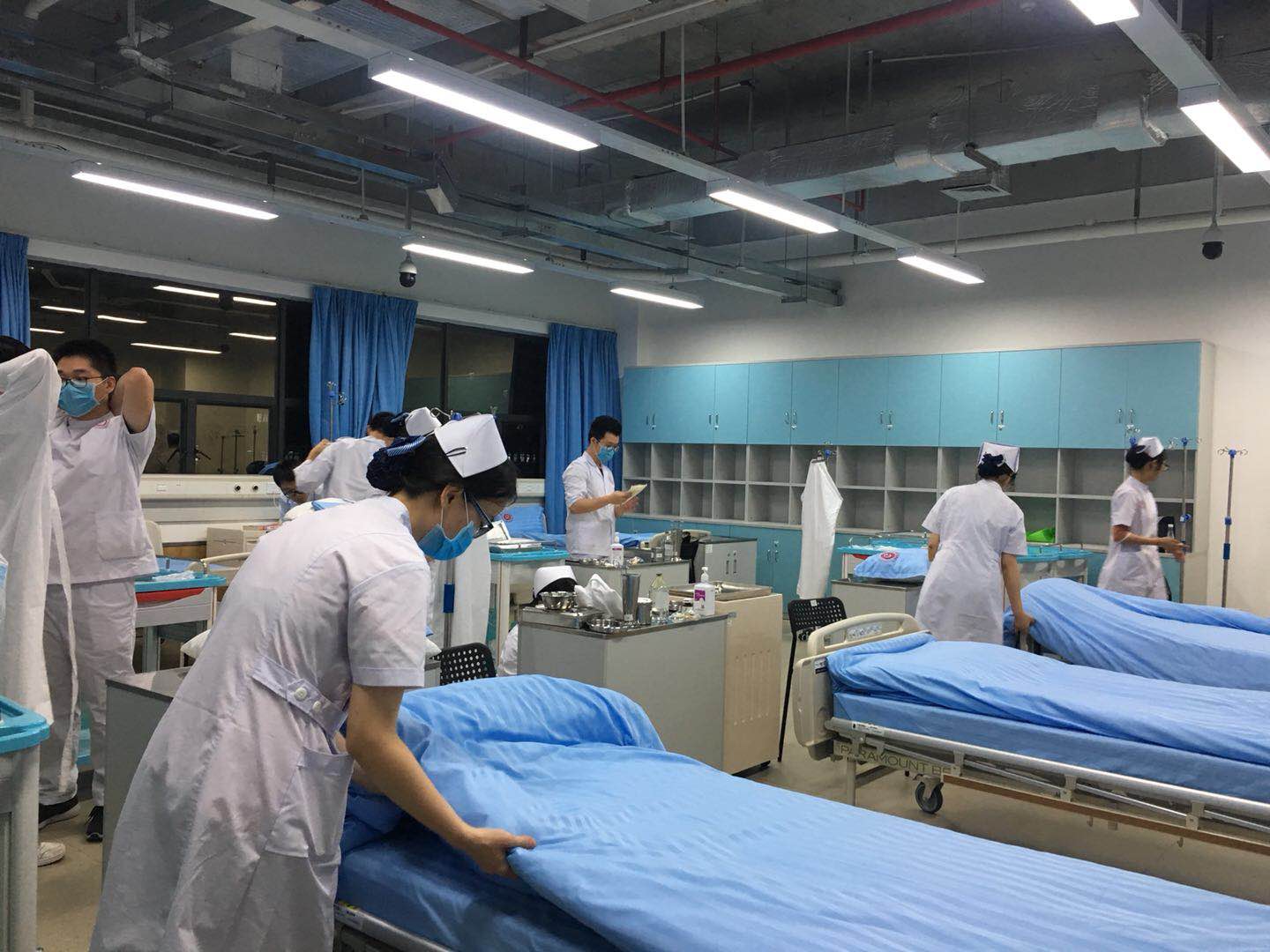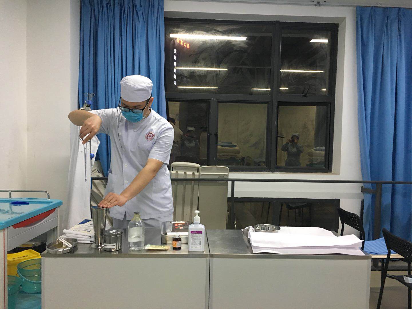 他们穿戴整齐,认真训练,精益求精,不断重复着铺床、无菌技术、穿脱隔离衣等技术操作。在护理学院的老师们的耐心指导下,他们不断地总结经验,力求使自己的技术更加规范熟练。