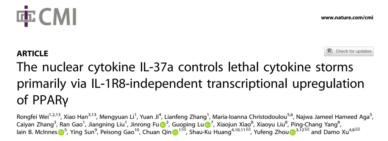 20231027日,JVID 徐大模/Shau-Ku Huang团队、复旦大学附属儿科医院/生物医学研究院周玉峰团队及中国医学科学院医学实验动物研究所秦川团队在Cellular & Molecular ImmunologyIF=24.1)杂志在线发表题为“The nuclear cytokine IL-37a controls lethal cytokine storms primarily via IL-1R8-independent transcriptional upregulation of PPARγ”的研究成果,揭示了IL-37a亚类的生物学特征和功能,特别是可以通过受体IL-1R8依赖和非依赖双重通路IL-37b更有效的抑制致死性细胞因子风暴和内毒素休克。