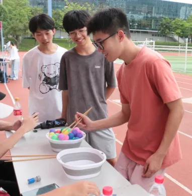 个人赛之筷子夹球:参赛者全神贯注,用筷子稳准狠地夹住乒乓球送到指定位置。