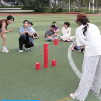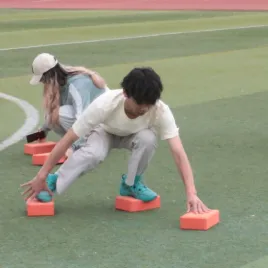 团体赛之摸石头过河:参赛队员们手脚并用,凭借三块 “石头” 在 “河面” 上灵活跳跃。