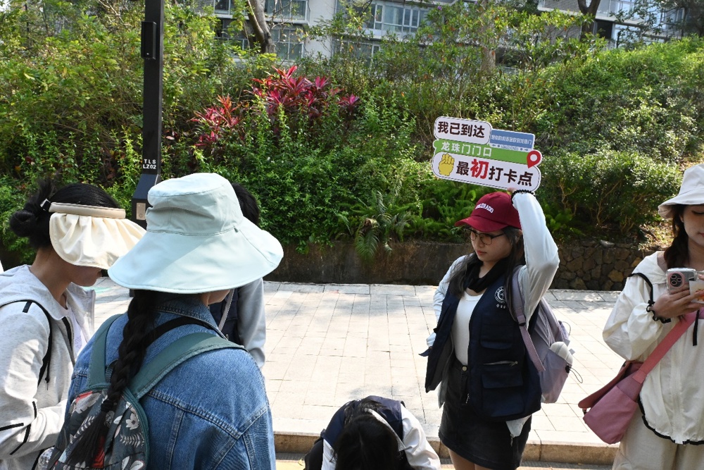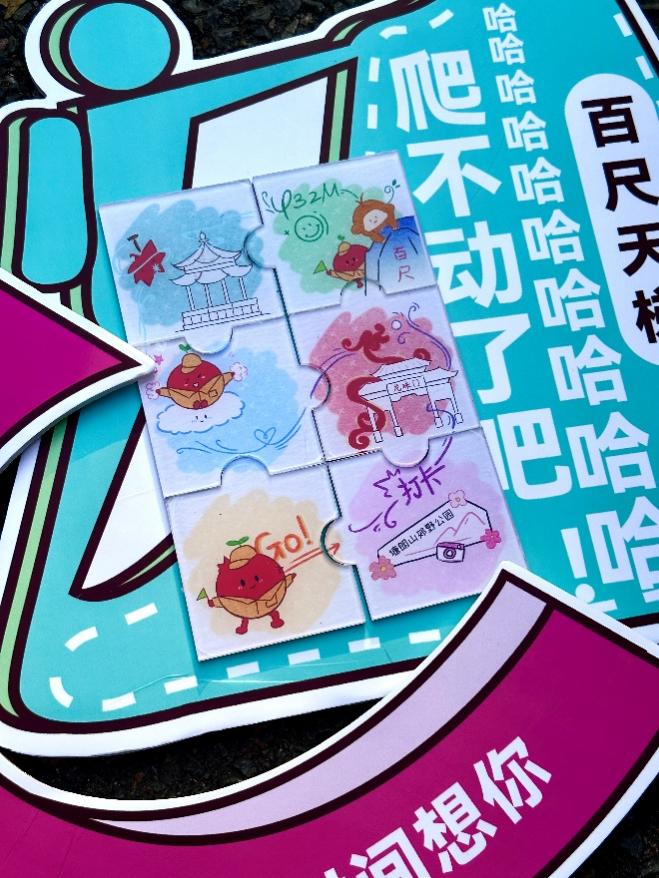 在部旗的猎猎飘扬中,徒步活动正式拉开序幕。参与者们紧随大部队,沿着既定路线踏入塘朗山。沿途绿荫如盖,清风拂面,宜人的自然环境使参与者得以缓解日常压力,全身心沉浸于自然之美中。为了提升活动的趣味性与参与度,工作人员在六处风景优美、适宜停留的地方设立了打卡点,参与者每至一处即可领取一枚塘朗山主题拼图冰箱贴,极大激发了参与者的探索兴趣。