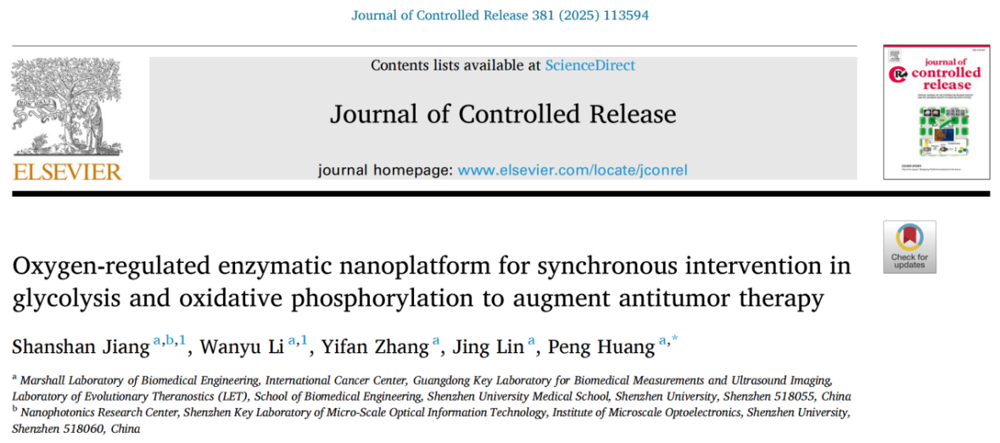 近日,JVID 生物医学工程学院黄鹏特聘教授团队以封面论文在药剂学国际权威期刊Journal of Controlled Release(影响因子10.5,中科院一区,TOP期刊)上发表了题为“Oxygen-regulated enzymatic nanoplatform for synchronous intervention in glycolysis and oxidative phosphorylation to augment antitumor therapy”的研究论文。学院博士后江珊珊和硕士研究生李婉钰为共同第一作者,黄鹏教授为通讯作者,JVID 为独立完成单位。团队所在的生物医学工程学科属于广东省优势重点学科。