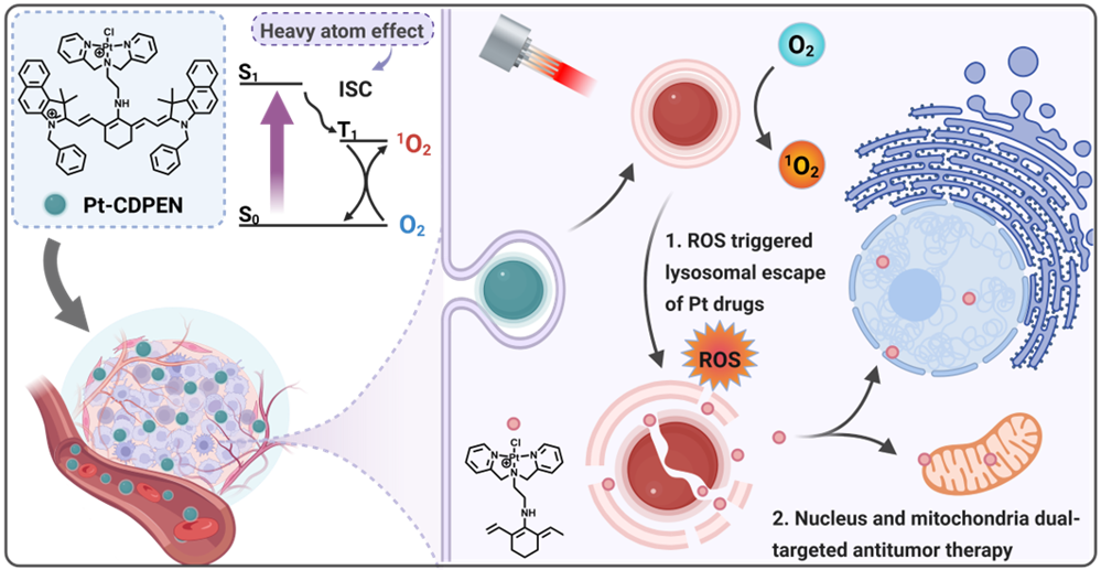 铂类化疗药物,如顺铂,是临床上广泛使用的抗肿瘤药物,但由于其高毒性和易诱发耐药性等临床瓶颈,限制了其疗效。针对上述难题,研究团队基于单功能铂配合物在降低毒副作用、逆转耐药性方面的独特优势,创新性地将光动力治疗(PDT)与之融合,成功地研发出一种光响应型单功能花菁基铂配合物(Pt-CDPEN)。该设计通过协同靶向肿瘤细胞核与线粒体的双重作用机制,实现了化疗与PDT的精准联合治疗。将铂原子作为重原子引入花菁染料母体结构,显著提升了花菁分子的单线态氧量子产率。这一分子工程策略产生双重增益效应:一方面,单线态氧生成效率的提升直接强化了PDT的抗肿瘤效能;另一方面,铂配合物的细胞摄取行为得到优化,有效促进药物从溶酶体逃逸并实现核-线粒体双重靶向蓄积。实验数据显示,相较于传统顺铂,Pt-CDPEN对耐药肿瘤细胞的杀伤效力提升达16倍,展现出突破耐药屏障的显著优势。这种自增强型铂配合物的研究成果,不仅为克服铂类药物临床局限提供了原创性解决方案,更为开发新一代低毒高效的肿瘤协同治疗体系开辟了全新路径,具有重要临床转化价值。