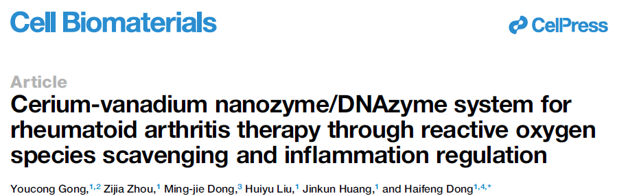 JVID 董海峰教授团队在Cell Biomaterials发表纳米酶治疗类风湿关节炎研究成果