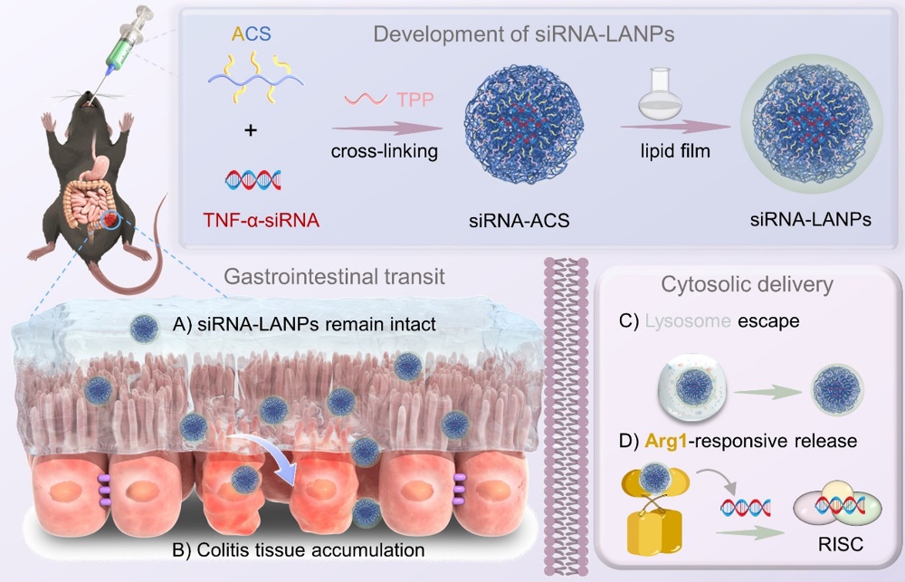 高效胞内递送小干扰RNA(siRNA)仍是RNA治疗领域的一项重大挑战,尤其在口服给药方面。因此,开发胞内响应释药的新靶标对于优化siRNA递送系统具有重要意义。鉴于炎性结肠黏膜中精氨酸酶1(Arg1)表达水平显著升高,我们开发了一种以精氨酸修饰壳聚糖(ACS)为载体、用于递送TNF-α siRNA的脂质纳米粒(siRNA-LANPs),以治疗溃疡性结肠炎。与天然底物L-精氨酸相比,siRNA-LANPs表现出更强的Arg1结合亲和力,可实现快速的Arg1响应释放。siRNA-LANPs在模拟消化液中12 h内保持纳米结构完整,对负载siRNA的保护率高达84.5%。口服给药后,siRNA-LANPs能有效穿透结肠黏液层,并优先富集于炎性结肠组织而非健康组织。在结肠炎小鼠模型中,siRNA-LANPs通过高效沉默TNF-α,显著减轻炎症严重程度,疗效优于临床一线药物柳氮磺吡啶。与转染试剂Lipo3000和TNF-α生物制剂英夫利昔单抗相比,siRNA-LANPs也表现出更优异的TNF-α沉默效率。其性能提升归因于多途径内吞作用、高溶酶体逃逸效率(29.7%)以及Arg1介导的胞质siRNA释放。综上,Arg1可作为溃疡性结肠炎治疗中一种理想的内源性刺激响应靶点,为实现口服siRNA递送提供新策略。