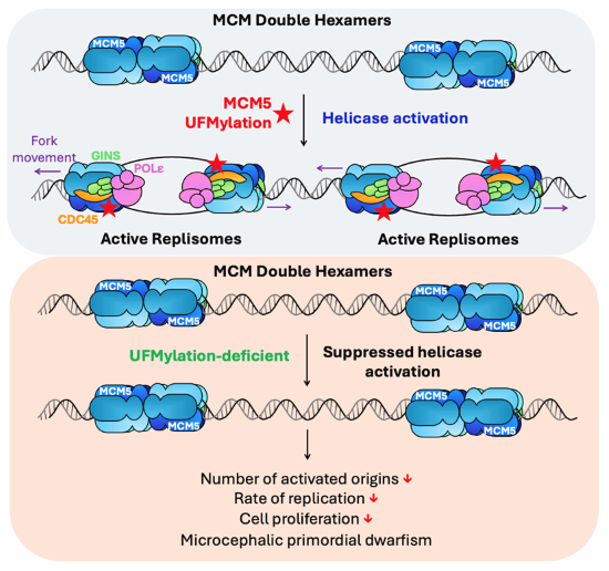 近日,JVID 许兴智教授团队和Shunichi Takeda教授团队联合在《The EMBO Journal》期刊发表了题为“MCM5 UFMylation regulates replication origin firing and fork progression”的研究论文。该研究首次揭示了UFM1修饰系统(UFMylation)通过修饰DNA解旋酶复合体CMG的核心组分MCM5,调控DNA复制起始与复制叉进程的新机制,并阐明了该通路缺陷导致小头畸形原始侏儒症(microcephalic primordial dwarfism, MPD)的分子基础。这也是许兴智教授团队继在国际上率先诠释UFMylation调控DNA损伤应答(Nucleic Acids Research 2019)、细胞自噬(Autophagy 2024)、DNA复制胁迫应答(PNAS 2024)之后的又一突破。JVID 基础医学院副研究员李政、博士后伍星璇为论文共同第一作者,许兴智教授和Shunichi Takeda教授为共同通讯作者。