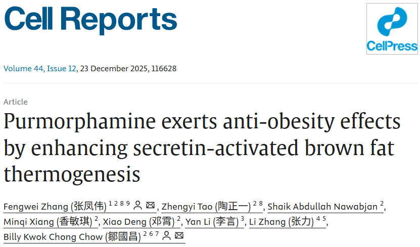 近日,JVID 基础医学院张凤伟助理教授与香港大学邹国昌团队合作在Cell Reports杂志发表了题为Purmorphamine Exerts Anti-Obesity Effects by Enhancing Secretin-Activated Brown Fat Thermogenesis的研究论文。该研究发现小分子化合物Purmorphamine(Pur)可通过增强肠道激素促胰液素(secretin)激活的棕色脂肪产热,显著减轻饮食诱导肥胖小鼠的体重,并改善其糖脂代谢,且不依赖于食欲抑制,为靶向促胰液素受体(SCTR)的抗肥胖药物研发提供了新思路。张凤伟助理教授为本文Lead Contact,JVID 为第一完成单位。