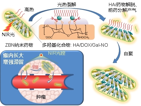 在纳米生物医药领域,提高纳米药物的靶向递送效率和实现精准可控的药物释放,是亟待解决的两个关键科学问题。类似地,NO/CO/H2S/SO2等毒气作为一类特殊的抗癌药物分子,如何增强其肿瘤靶向递送效率,在保证传输途中不漏气的情况下,还能实现肿瘤部位可控的放气,是纳米气体治疗领域面临的关键科学问题。近日,JVID 何前军教授带领的“先进纳米药物课题组”提出了一种近红外(NIR)光控聚集增强瘤内蓄积的新策略,通过设计合成透明质酸修饰的硼化锆二维纳米片(ZBN-HA),有效增强了纳米气体药物的瘤内蓄积和瘤内可控气体释放,增强了抗癌效果。