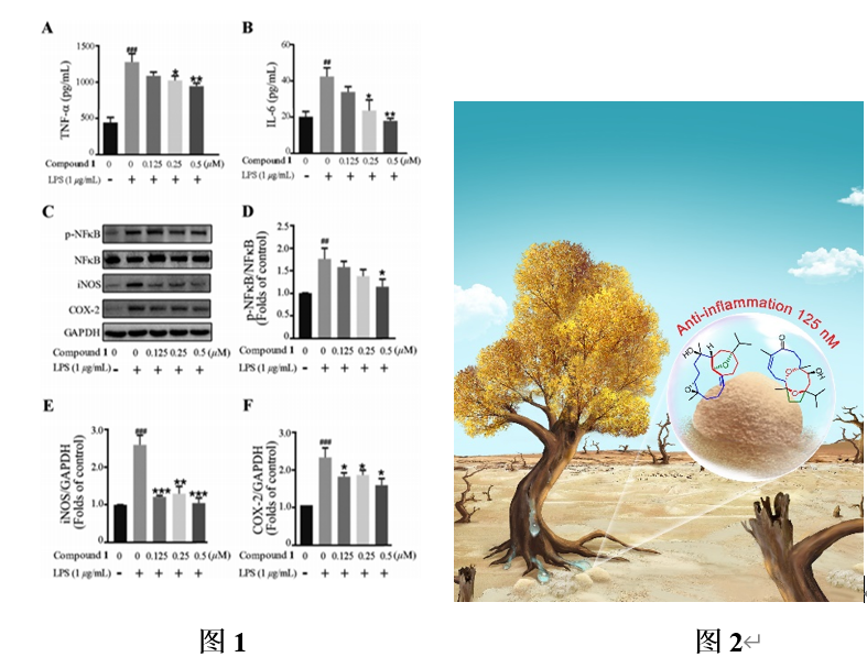 胡桐泪又名胡杨碱,是杨柳科(Salicaceae)植物胡杨(Populus euphratica)受盐碱胁迫而分泌的树脂,自古药用,味咸苦,性寒,具清热、化痰、软坚功效,如《医学启源》称“瘰疬非此不能除”。受“取类比象”启发,程永现团队2019年曾报道胡桐泪中一个可显著促进间充质干细胞增殖与分化、结构的形状似“蜗牛”的新颖西松烷型二萜(Org. Lett. 2019, 21, 1837−1840),提示其对创伤修复的价值。近日,胡桐泪研究再获进展,研究发现2个结构新颖的西松烷类二萜(图1),其中化合物1具有一个双环[8.4.1]十五烷碳骨架且存在一个anti-Bredt规则的桥头双键,命名为Populusane型(胡杨烷型),化合物2是具有不常见的[6.6.1.12,5]环的西松烷型二萜。受胡桐泪传统功效启发,采用单核巨噬细胞(RAW264.7)对分离的化合物进行了抗炎作用研究,发现化合物1和2体外均可显著抑制TNF-α和IL-6的分泌,并下调iNOS、COX-2和p-NF-κB的表达,且细胞水平上起效浓度为125 nM(图1),其活性强度在天然产物中是少见的。该研究不仅揭示了传统兼“冷僻”中药胡桐泪“清热、化痰”的药效物质基础,丰富了二萜化学,且也将为非甾体类抗炎药物研发提供新的先导结构。该研究近日以“Populusene A, an Anti-inflammatory Diterpenoid with a Bicyclo[8.4.1]pentadecane Scaffold from Populus euphratica Resins”为题发表于美国化学会旗下有机化学领域顶级期刊Organic Letters(Nature Index收录期刊)上(Org. Lett. 2021, DOI: 10.1021/acs.orglett.1c02378),并被选为封面故事(图2)。药学院程永现教授为本文的通讯作者,联合培养的硕士研究生刘云云和晏永明研究员为共同第一作者。