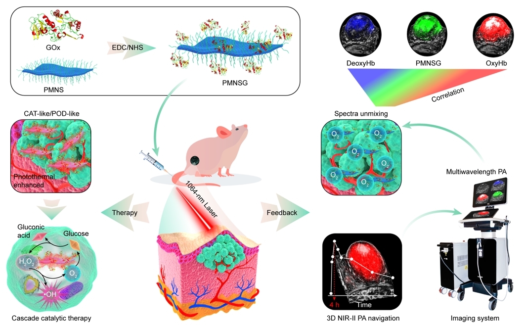 生物体内的化学反应绝大多数属于酶促反应,无论是内源酶或外源酶引发的活体催化反应,其过程都伴随着多种分子事件的动态变化,而通过分子影像手段对这些分子事件进行同步实时的监测,能够加深人们对这些生物学过程的理解。要实现这一目标,除了要有灵敏的成像技术,还需要稳定的酶促催化系统。基于此,该团队利用天然酶和纳米酶联姻,成功地构建了级联催化反应系统(PMNSG),该系统具体由天然酶(葡萄糖氧化酶,GOx)和纳米酶(二维钯钼纳米酶,PMNS)组成。该研究发展了多光谱三维光声(3D PA)成像技术,实现了活体级联催化反应中多分子事件的实时监测,为肿瘤催化治疗提供了精确指导(如下图)。