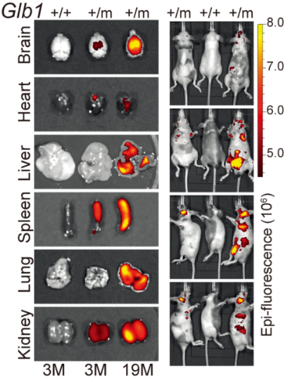 细胞衰老时,溶酶体的数量增多,溶酶体中的β-半乳糖苷酶的表达上升,在pH6.0时,检测衰老相关的β-半乳糖苷酶活性的染色方法(SA-β-gal staining)被广泛用于鉴定细胞衰老。以此理论基础为出发点,研究团队设计构建了GAC报告系统,即在编码β-半乳糖苷酶的基因Glb1后插入(knock-in)编码mCherry荧光蛋白的序列,用于报告Glb1的表达水平。团队通过分析体内组织自然衰老,体外细胞复制性衰老,应激诱导的细胞和组织病理性衰老等实验证实,Glb1表达水平在衰老组织和细胞中显著上升,可以作为细胞衰老新标志物,且mCherry荧光信号(GAC)能有效标记衰老细胞,报告组织和系统衰老(图1)。