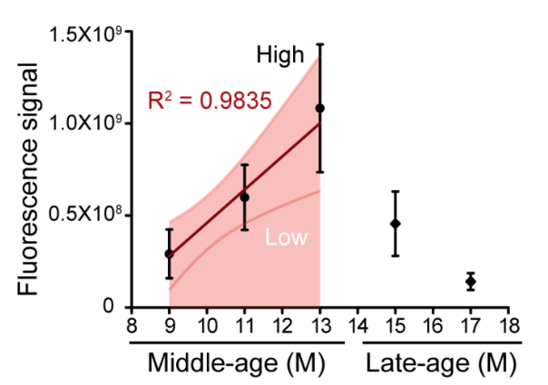 在检测各年龄段小鼠活体荧光时,发现GAC信号在小鼠中年时间段(9~13月龄)表现出与实际年龄存在线性相关(图2)。