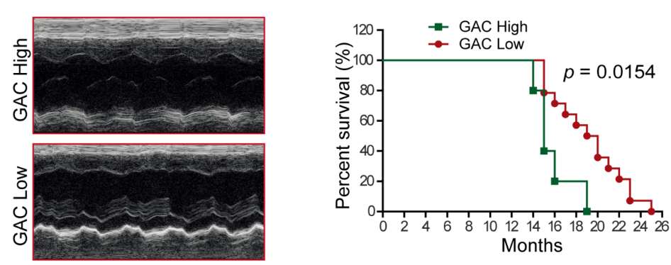进一步分析发现,这群中年小鼠中约20%比例的小鼠GAC荧光信号较高,并且这些高GAC荧光小鼠出现心脏肥大、心功能异常(图3),比低GAC荧光的小鼠寿命显著缩短(图4)。