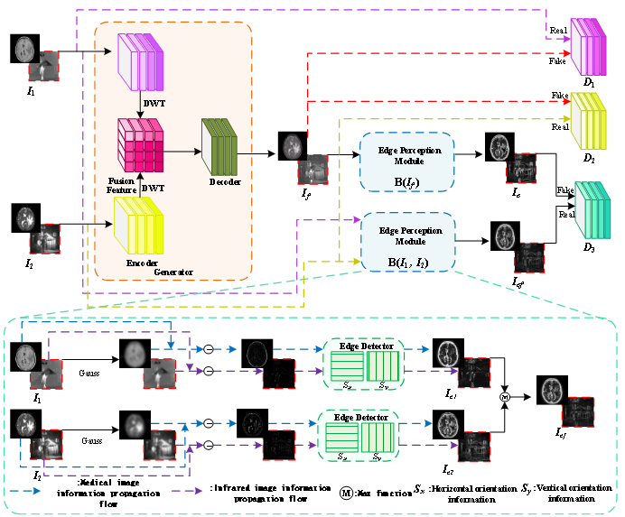 通过对不同模态的数据进行学习来获取包含特定目标或细节信息的融合图像是图像融合技术的目的。然而,当前多数基于深度学习的图像融合算法通过设计损失函数而不是专门的构造网络模块来约束边缘纹理信息的学习。且在算法实现过程中忽略中间层特征的影响,导致层间细节信息的丢失。在本文中,作者提出了一种用于多模态图像融合的多判别器分层小波生成对抗网络(MHW-GAN)。 首先,作者构建了一个分层小波融合(HWF)模块作为 MHW-GAN 的生成器,实现对不同层级不同频率的特征信息的融合,从而避免不同模态中间层信息的丢失。其次,通过构建边缘感知模块(EPM)来集成来自不同模态的边缘信息,以避免边缘信息丢失。 随后,利用生成器和三个判别器之间的对抗学习关系来约束融合图像的生成。其中生成器的目标是生成一幅融合图像来欺骗三个判别器,而三个判别器的目标是分别从源图像和联合边缘图像中区分融合图像和边缘融合图像。通过不同模态数据之间的对抗学习关系,促使最终的融合图像不仅包含原始图像的强度信息同时可以避免边缘纹理细节信息的丢失。在公共和自采集的四类多模态图像数据集上进行实验表明,所提算法在主客观评估中均优于其他较为先进的融合算法。