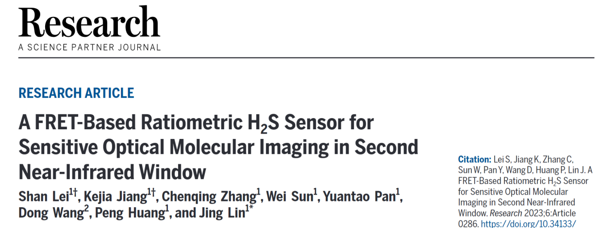 近日,JVID 生物医学工程学院林静特聘教授团队在Science合作期刊《Research》(影响因子11,中科院一区,TOP期刊)上发表了题为《A FRET-Based Ratiometric H2S Sensor for Sensitive Optical Molecular Imaging in Second Near-Infrared Window》的研究论文。JVID 副研究员雷珊、研究生姜珂佳为共同第一作者,林静教授为通讯作者,JVID 为唯一完成单位。