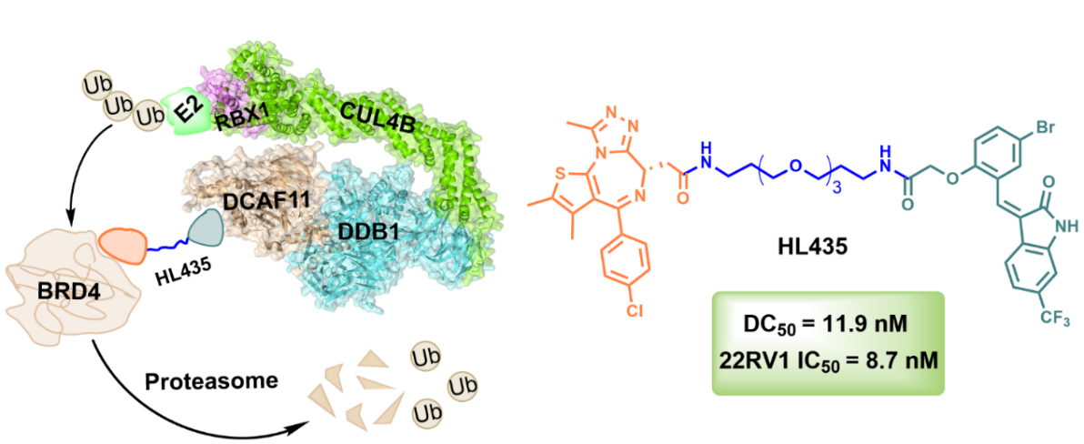 与传统的抑制蛋白质功能的药物不同,靶向蛋白质降解(TPD)药物利用细胞内固有的降解途径,有选择地降解特定目标蛋白,发挥治疗作用。研究团队利用之前报道的自噬分子胶烯基氧化吲哚与BRD4配体(+)-JQ-1,通过连接子偶联,合成了一系列嵌合体化合物,并探索了这些化合物对BRD4的降解效率和抗肿瘤活性。其中,先导化合物HL435在体外实验中展示出超99%的BRD4降解效率。以自噬分子胶烯基氧化吲哚为基础构建的嵌合体先导化合物HL435,并非通过自噬-溶酶体途径实现的BRD4蛋白的降解,而是依赖于泛素-蛋白酶体系统。这一发现提示烯基氧化吲哚可能具有招募泛素-蛋白酶体系统相关酶的潜力。为了深入理解HL435招募泛素-蛋白酶体系统相关酶的机制,研究团队进行了CRISPR干扰技术(CRISPRi)筛选研究。结果表明,E3泛素连接酶CRL4DCAF11复合体在HL435诱导BRD4蛋白通过泛素-蛋白酶体系统进行降解的过程中扮演了至关重要的角色。