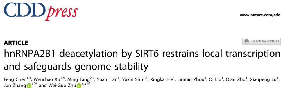 JVID 朱卫国教授团队在 Cell Death & Differentiation发表RNA结合蛋白hnRNPA2B1维持基因组稳定性研究成果