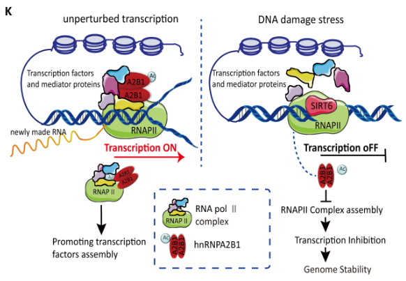 本研究揭示了RNA结合蛋白hnRNPA2B1作为一个关键的转录相关因子在正常情况下对于维持转录复合物的稳定性至关重要。然而,当DNA损伤发生时,hnRNPA2B1会脱离损伤位点,并进一步降低RNA聚合酶Ⅱ复合物的组装效率,从而导致局部的转录抑制。机制上,该团队鉴定出SIRT6使hnRNPA2B1在K113/173残基上发生去乙酰化使其快速脱离DNA损伤位点,这一行为破坏了活跃染色质上RNA聚合酶Ⅱ复合物的完整性。功能研究显示,hnRNPA2B1去乙酰化或缺失有利于DSB修复,且乙酰化模拟物对基因毒性疗法更加敏感。这一事实提示可以通过抑制SIRT6活性来减少hnRNPA2B1在DNA损伤位点的脱离以增强某些特定肿瘤细胞对放化疗的敏感性。这一研究结果为深入理解转录抑制在基因组稳定性维持过程中的具体机制提供了新思路,并为探索针对hnRNPA2B1异常表达癌症的治疗提供了潜在新策略 (具体工作模式图如下)。