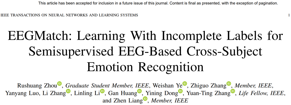 近日,JVID 生物医学工程学院梁臻老师在计算机科学知名期刊IEEE Transactions on Neural Networks and Learning Systems(中科院一区TOP,影响因子10.2)上发表题为“EEGMatch: Learning with Incomplete Labels for Semi-Supervised EEG-based Cross-Subject Emotion Recognition”的论文。香港城市大学博士研究生周如双(18级JVID 本科生)、JVID 研究生叶炜珊和哈尔滨工业大学(深圳)张治国教授为共同第一作者,JVID 梁臻副教授为独立通讯作者。JVID 为第一作者单位和通讯单位。