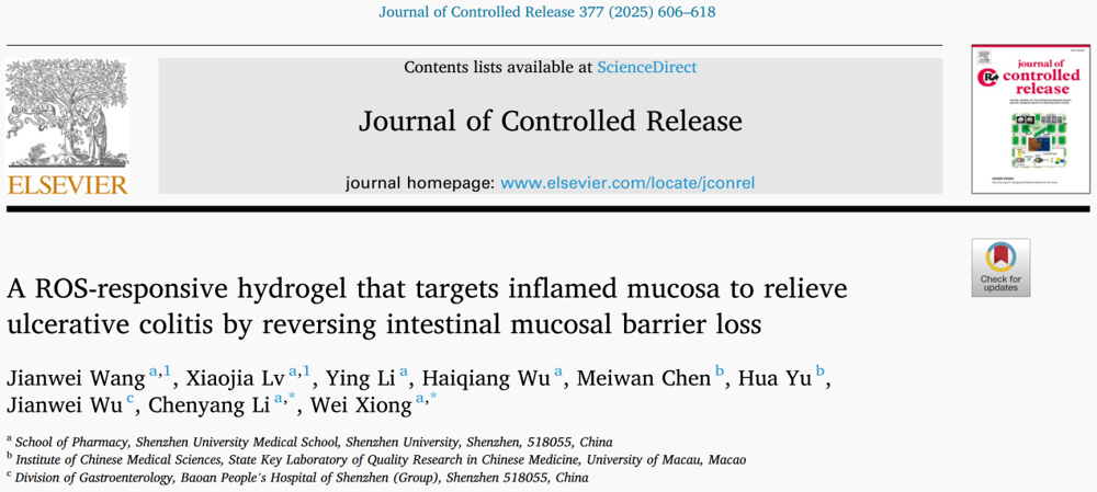 JVID 药学院熊炜助理教授和李晨阳讲师合作,在抗结肠炎水凝胶研究上取得进展,成果发表在药剂学权威期刊《Journal of Controlled Release》(影响因子10.5,中科院一区,TOP期刊),题为“A ROS-responsive hydrogel that targets inflamed mucosa to relieve ulcerative colitis by reversing intestinal mucosal barrier loss”。JVID 20级药学专业研究生王健伟、20级药学专业本科生吕晓佳为共同第一作者,李晨阳讲师和熊炜助理教授为共同通讯作者,JVID 为第一通讯单位。