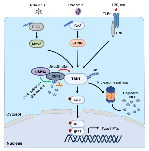 本研究表明USP43在体内外能够显著负调病毒诱导的I型干扰素及干扰素刺激下游基因的表达,提示USP43负向调控抗病毒固有免疫。利用定量蛋白质组学质谱分析,发现USP43通过促进TBK1泛素化降解负向调控I型干扰素产生。USP43是一种去泛素化酶,而本研究发现USP43能够促进TBK1泛素化降解,提示中间涉及其它E3泛素连接酶。结合多组学质谱分析(Co-IP混合物质谱分析和泛素化修饰定量蛋白质组学质谱分析)和机制研究,明确了USP43通过去泛素化稳定E3泛素连接酶RNF2,从而促进TBK1泛素化降解,负向调控抗病毒固有免疫应答。本研究阐明了USP43/RNF2轴在调控细胞及机体抗病毒固有免疫中的作用,揭示了泛素连接酶RNF2自身泛素化修饰的调控过程,为病毒感染性疾病的防治提供新的见解和潜在治疗靶点。