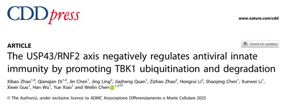 JVID 陈玮琳教授团队在 Cell Death & Differentiation发表USP43/RNF2轴调控抗病毒固有免疫研究成果