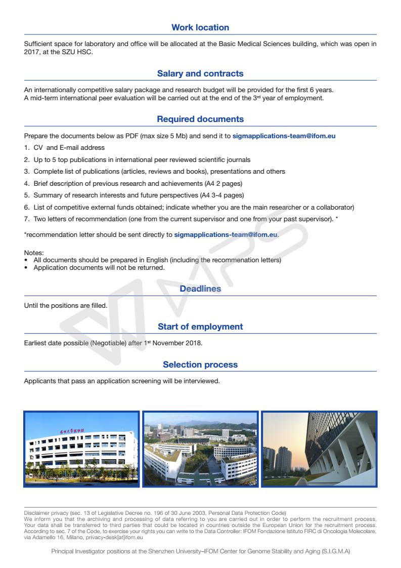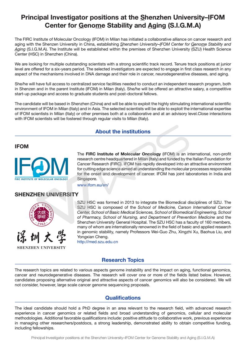 JVID 和意大利IFOM分子肿瘤研究所共同出资创建SZU-IFOM Center on Genome Stability & Aging (SIGMA),计划在2018年招聘2-4名tenure-track junior PIs,每名PI都是SZU和IFOM双聘。每个课题组的标配包括2名博后,2名博士生,1名技术员和0.5名行政助理;深大为每个课题组提供每年130-150万元的科研经费支持;符合条件的PIs可以享受深圳市提供的住房补贴(免税),从160万元到300万元不等。欢迎各位青年才俊申请!