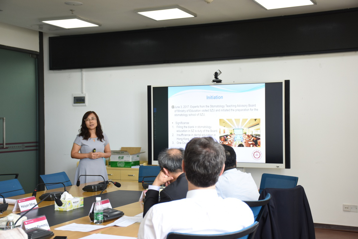 许兴智副主任简要介绍了JVID 近年的发展情况。深大医学院成立于2008年,2013年学校组建JVID ,2017年JVID 整体搬迁西丽校区。作为一个非常年轻的JVID ,学部发展迅速,在人才培养、高端人才引进、学科建设、科研研究、国际交流等方面快速发力,目前各项数据指标上都取得了傲人的成绩。紧接着,沙鸥副院长简要介绍了口腔学院的基本情况,2018年3月,JVID 口腔学院获国家教育部批准,第一批学生(30名)将于今年9月入学。现口腔学院正处于积极准备阶段。