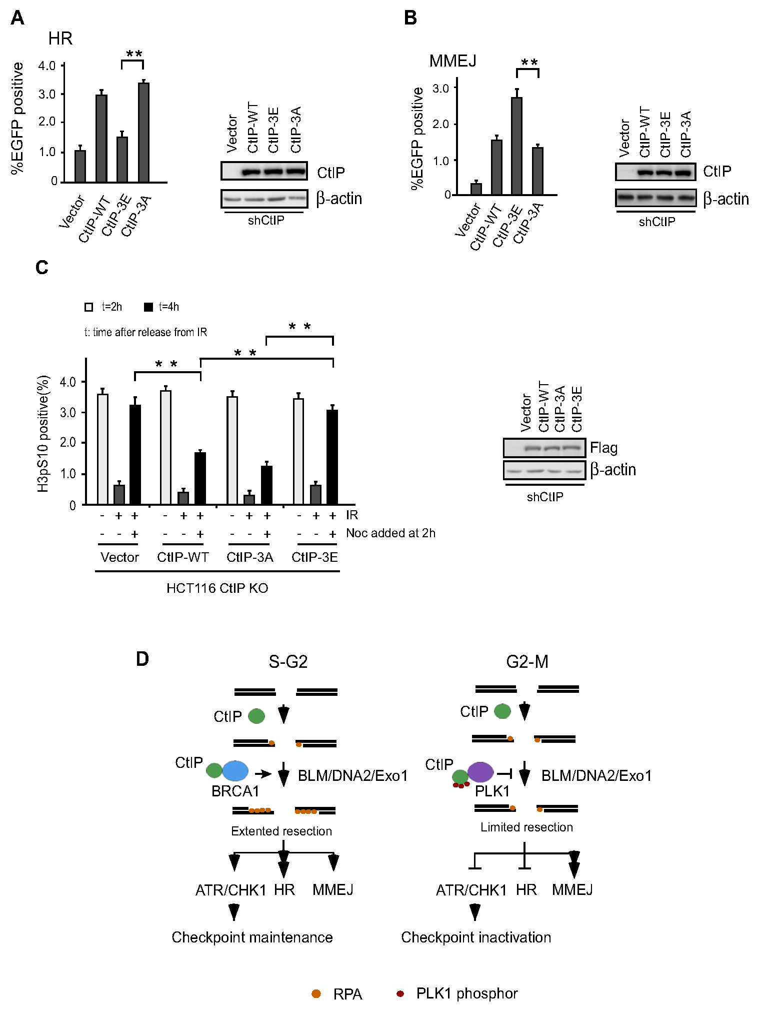 近日,JVID 许兴智教授团队在国际知名期刊Nucleic Acids Research(影响因子11.561)上在线发表了题为“PLK1 targets CtIP to promote microhomology-mediated end joining”(doi: 10.1093/nar/gky810)的原创研究成果。DNA双链断裂(DSBs)是危害性最大的DNA损伤形式,DSBs的错误修复与基因组不稳定及其相关疾病(如肿瘤、神经退行性疾病、衰老)直接相关。DSBs的修复途径主要包括高保真的同源重组(HR)介导的修复、错误倾向的非同源末端连接(NHEJ)和微同源末端连接(MMEJ)。在起始阶段对DSBs断端的不同程度的处理决定了修复途径的选择:HR需要对断端进行远程的末端切除(end resection)以暴露足够长的单链DNA,NHEJ基本上不需要对断端进行末端切除,而MMEJ需要对断端进行有限的末端切除。许教授团队发现:在细胞周期G2/M过渡期,有丝分裂激酶CDK1/Aurora A对核酸酶 CtIP在S327的磷酸化修饰将另一个有丝分裂激酶PLK1募集到CtIP,进而PLK1对CtIP在S723位点的磷酸化修饰抑制了CtIP对DSBs断端的远程切除和HR修复,但促进了MMEJ介导的DSBs修复。这些发现诠释了PLK1等有丝分裂激酶在多种恶性肿瘤 高表达的生物学基础,为肿瘤治疗提供了潜在的新靶点和新策略。