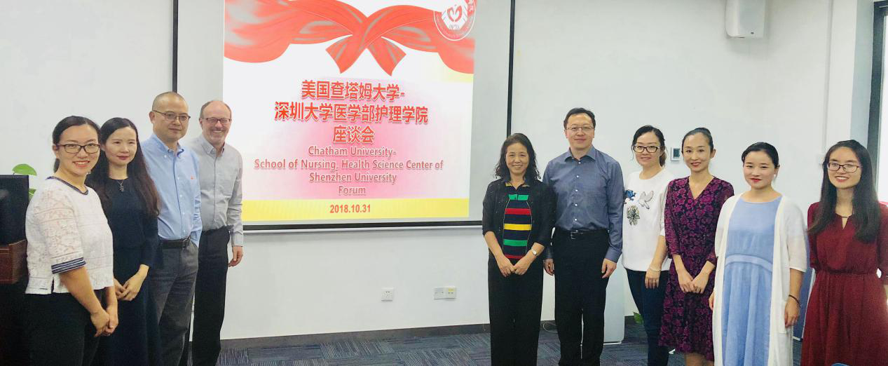 10月31日下午,美国查塔姆大学David Finegold 校长一行四人来访JVID 西丽校区。JVID 副主任许兴智教授、护理学院院长王惠珍教授接待了来宾并在西丽校区A6办公楼811会议室进行座谈。在座谈会之前,JVID 副校长王晖与David校长进行了对话,表示JVID 将大力支持查塔姆大学与JVID 在护理专业的交流合作。