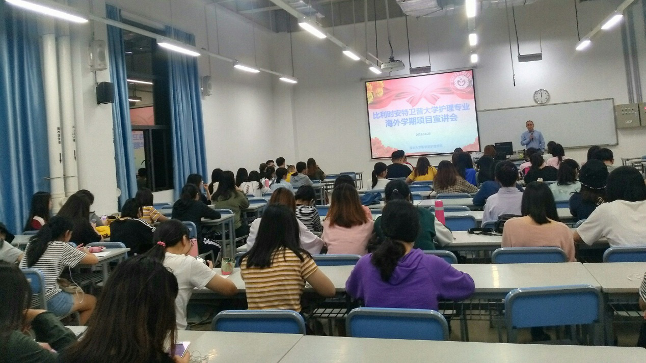 10月23日下午,西丽校区A6-102会议室举办了比利时安特卫普大学护理专业海外学期项目宣讲会。JVID 副主任许兴智教授、护理学院院长王惠珍教授、护理学院副院长孙丽媛副教授以及JVID 护理学院2016级全体学生参加了本次宣讲会,本次宣讲会由护理学院方淇玉老师主持