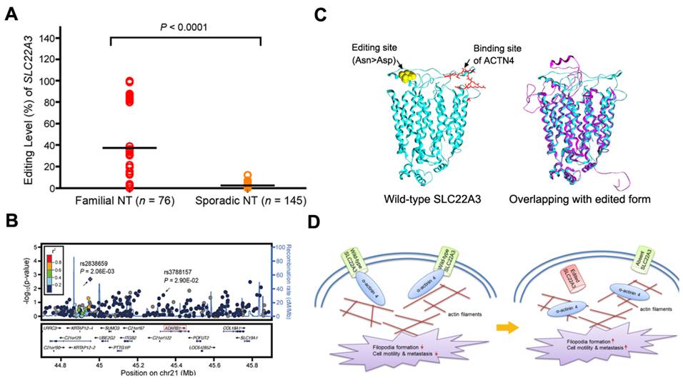 课题组首次证实在76例家族性食管癌患者癌旁组织中,SLC22A3基因的转录水平显著低于散发性食管癌。近一步研究发现SLC22A3 mRNA序列的第261位碱基在家族性食管癌患者癌旁组织中频繁并特异地出现一种A-to-I 型RNA突变(图A),该突变可导致SLC22A3的RNA稳定性降低;并发现具有调控RNA突变功能的另一新型家族性食管癌易感基因ADARB1参与SLC22A3的表达下调(图B)。机制研究表明,突变后的SLC22A3蛋白结构发生改变(图C),对细胞丝状伪足(filopodia)的重要组成蛋白ACTN4的抑制性结合能力减弱,增加细胞的迁移与侵袭能力(图D),揭示了家族史阳性的食管癌患者相对于散发患者较早便出现恶性转移的分子机制。