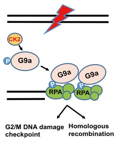 朱卫国教授研究团队在本研究中,发现重要的表观遗传学分子——组蛋白甲基化修饰酶G9a在发生DNA双链损伤的情况下会被迅速招募到DNA损伤位点,提示G9a有可能在DNA损伤修复过程中起作用。进一步的研究表明,体内的G9a第211位丝氨酸会被重要的磷酸激酶CK2催化发生磷酸化修饰,并且在诱导DNA损伤的情况下G9a第211位丝氨酸的磷酸化修饰会增加。而G9a第211位丝氨酸的磷酸化修饰对其到DNA损伤位点的招募过程起关键作用。进一步的实验探索发现G9a招募到DNA损伤位点后会招募一个重要的同源重组修复蛋白复合物RPA复合物。研究人员发现RPA复合物中的RPA70在体内体外均可以与G9a直接结合,而且这种结合在发生DNA损伤的情况下会发生增加。进一步的实验证明,在DNA损伤的情况下,G9a与RPA复合物在DNA损伤位点的结合对于DNA的修复过程至关重要。,如果将G9a敲除或者敲低均会导致细胞内DNA损伤修复效率的下降,同时细胞生存率也会降低。该研究发现了表观遗传学分子G9a参与DNA损伤同源重组修复途径的分子机制,找到了肿瘤细胞中CK2-G9a-RPA这样一条新的对于同源重组修复途径的调节方式,对于进一步理解表观遗传学在DNA损伤修复中扮演的角色有很大的帮助,同时对于未来在临床上针对G9a研发靶向抑制剂治疗肿瘤有重要的提示意义。